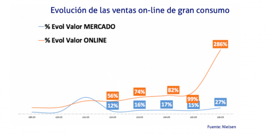 En este sentido, sectores como el del gran consumo, que hasta ahora no representaba más que un 2% de la venta global on-line, han superado ya cualquier estimación previsible en sus canales de comercio electrónico para el año 2020.