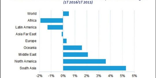 Además, en los tres primeros meses de 2016 han experimentado un incremento similar, también del 5,3%, con respecto al mismo periodo de 2015, siendo la región que más ha crecido en el presente año.