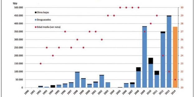 Durante el 2013 se enviaron al desguace alrededor de 380.000 TEUs, de los que 67 eran buques de más de 3.000 TEUs, mientras que en el primer trimestre del 2014 se enviaron 0,17 millones, la mayor cifra trimestral de desguaces.