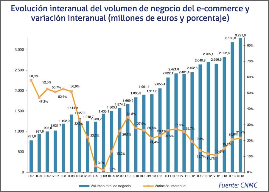 El e-commerce ha generado en el tercer trimestre de 2013 un volumen de negocio de 3.291 millones de euros, lo que supone un 21,7% más que en el mismo periodo del año, así como un nuevo récord de facturación en España, según el informe elaborado por la Comisión Nacional de los Mercados y la Competencia (CNMC), sobre el comercio electrónico en España a través de entidades de medios de pago.