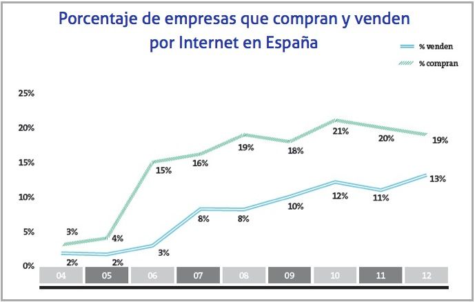 Pese a que la economía española está pasando por la peor situación económica que se recuerde desde 1993, el porcentaje de empresas que venden y el porcentaje de empresas que compran por Internet, está creciendo de una manera considerable desde el año 2004. Por lo que el porcentaje de empresas que vende en Internet entre 2004 y 2012 ha crecido desde un 2% a un 13%, mientras que las compañías que compran ha pasado de un 3% a un 19%.
