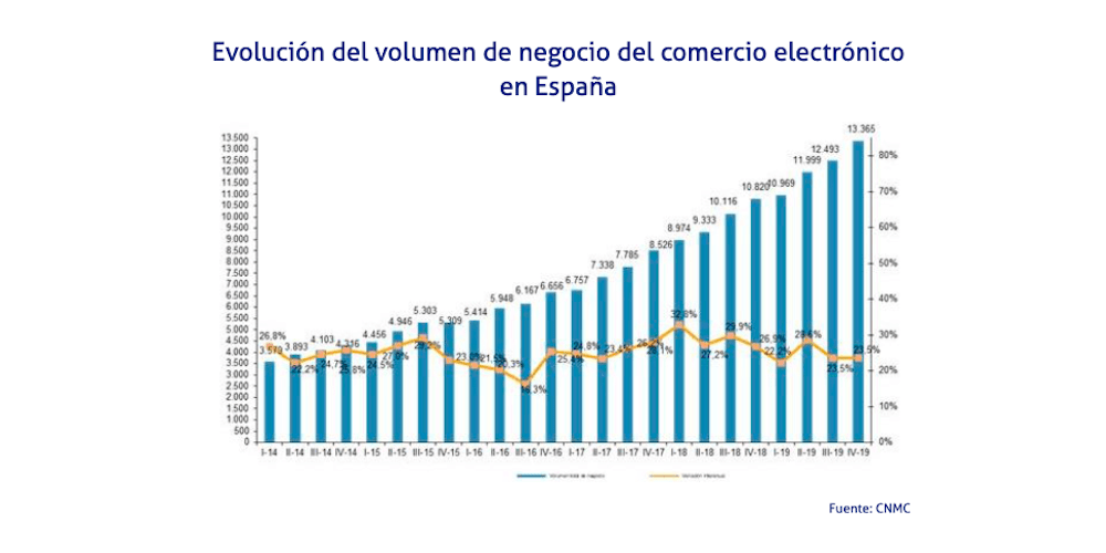En todo el pasado ejercicio, el comercio electrónico ha tenido una facturación en España de 48.826,18 millones de euros, volumen que implica un crecimiento anual con respecto a 2018 de un 24,42%.