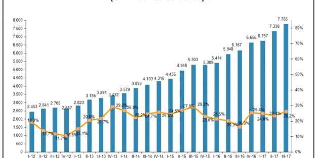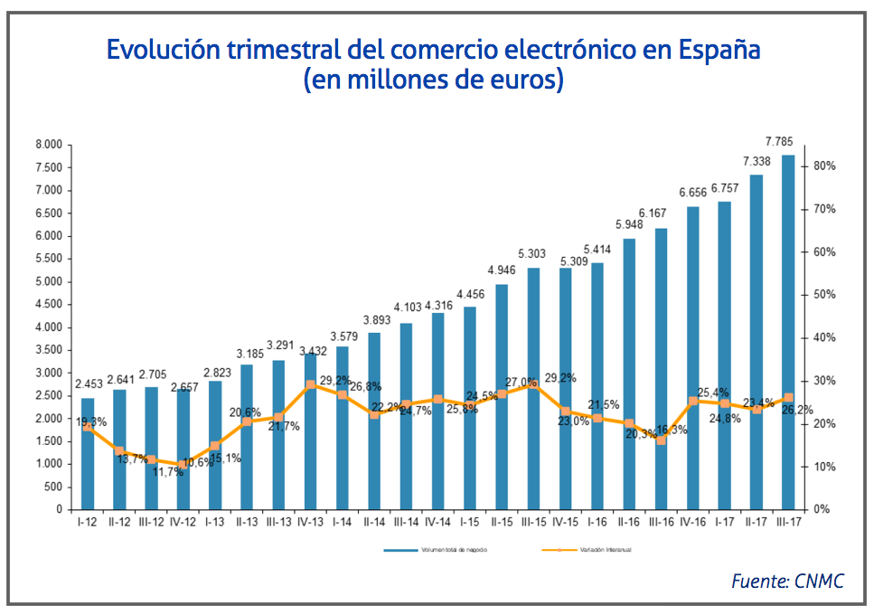 La facturación del comercio electrónico en España ha crecido un 26,2% en el tercer trimestre de 2017, hasta sumar 7.785 millones de euros, según los últimos datos publicados por la Comisión Nacional de los Mercados y la Competencia (CNMC).