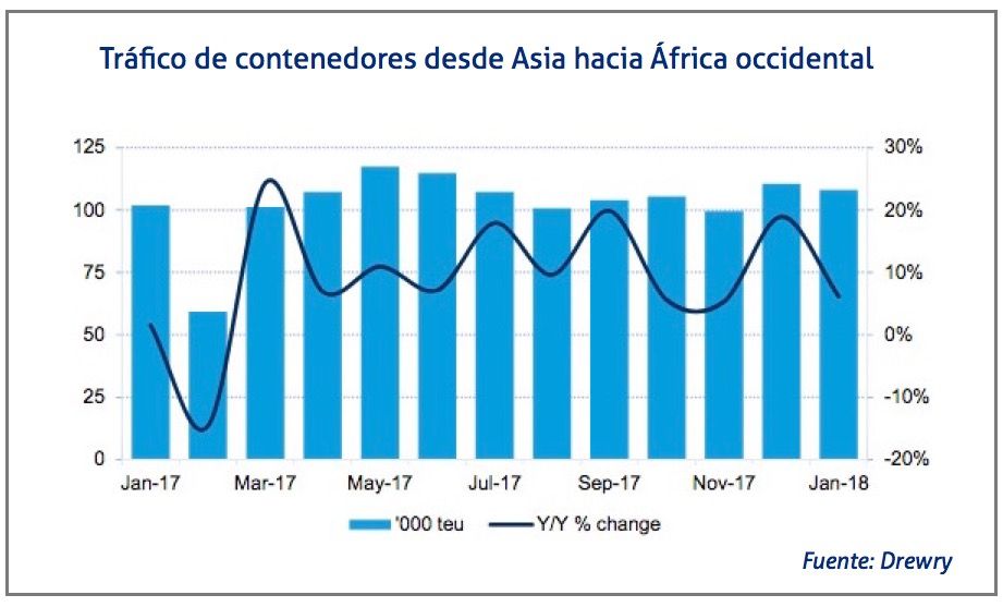 El tráfico de contenedores entre Asia y África occidental ha anotado un crecimiento del 9,6% en 2017, llegando a los 1,2 millones de TEUs. Sin embargo, esto no ha supuesto un incremento de las tasas debido a la sobrecapacidad actual en la ruta, según recoge el último informe de la consultora Drewry.
