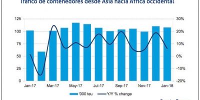 En enero de 2018, el tráfico ha repuntado un 6%, aunque resulta más prudente fiarse de la media de los últimos 12 meses y las cifras del primer mes del año solamente han logrado incrementarla ligeramente hasta el 10%. En cualquier caso, la consultora anticipa que el tráfico de contenedores entre Asia y África Occidental mantendrá una trayectoria positiva durante el año.