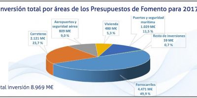 Lo destinado a infraestructuras sufre un recorte del 10,9%, hasta los 5.391 M€. En cuanto a las inversiones totales del Grupo Fomento en 2017, ascienden a 8.969 millones de euros, que equivale a un crecimiento del 45% respecto del total ejecutado en 2016.