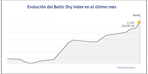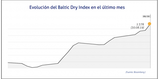 El Baltic Dry Index, BDI, que refleja los precios de los fletes de los buques graneleros tomando como referencia un total de 23 rutas marítimas, se ha situado el viernes 30 de agosto de 2019 en los 2.378 puntos, lo que supone un ascenso de 101 puntos o del 4,44%.