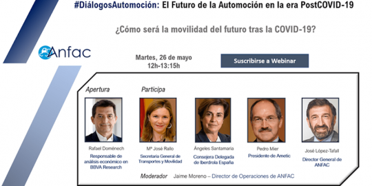 La Asociación Española de Fabricantes de Automóviles y Camiones, Anfac, celebra el día 26 de mayo su segundo webinar de la serie 'Diálogos sobre Automoción'. En este caso, el tema a tratar será 'El futuro de la automoción en la era postCovid-19'.