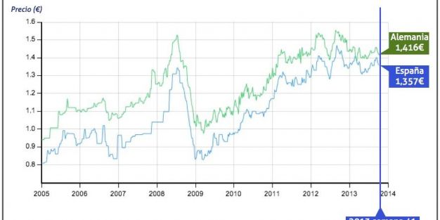 Mientras, la gasolina se encuentra algo más barata que la media del año e incluso cerca de su mínimo de 2013, de 1,396 euros, frente al precio máximo del ejercicio, alcanzado en febrero, cuando llegó a los 1,509 euros el litro.
