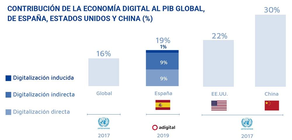 Según datos de Adigital, el tamaño de la economía digital en España se aproxima al 19% del PIB en 2019, volumen que la coloca como el segundo sector económico del país, solo por debajo del inmobiliario, y con un impacto directo que ronda el 9% del PIB español en 2019.
