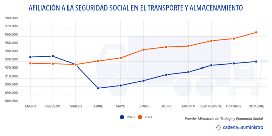 El volumen de afiliados a la Seguridad Social en el segmento de transporte y almacenamiento sigue al alza en noviembre, con el pico estacional de fin de año a toda máquina para el sector.