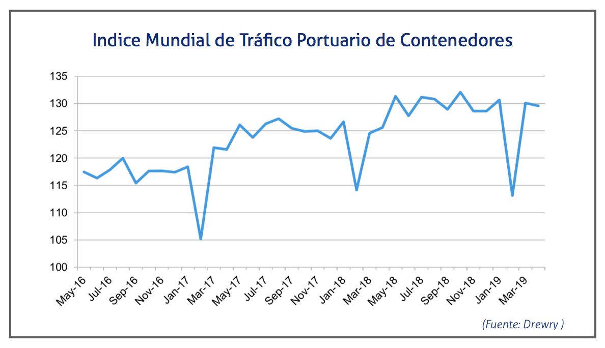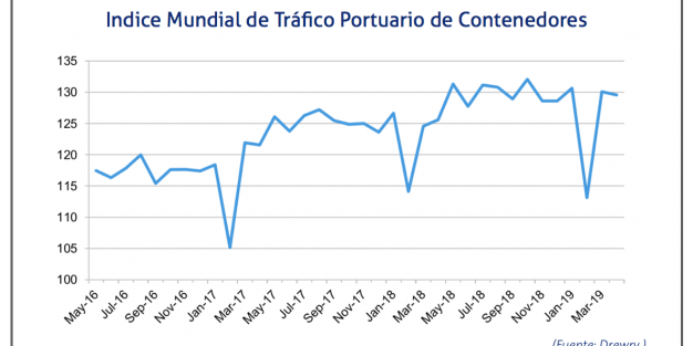 El índice, realizado a partir de los datos de más de 220 puertos alrededor del mundo, refleja un estancamiento en China, con 139 puntos, apenas un 0,2% más que el mes anterior. Esta cifra es cinco puntos o un 3,5% superior a la de abril del año 2018.
