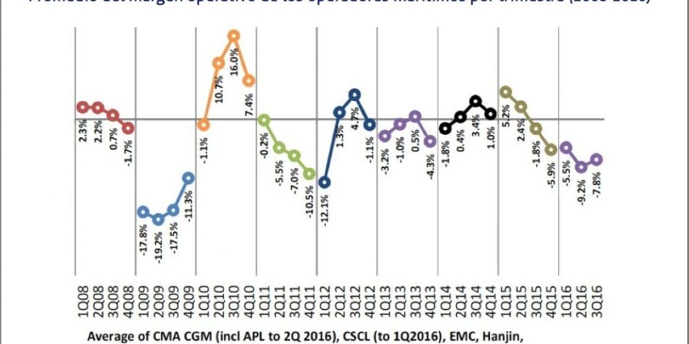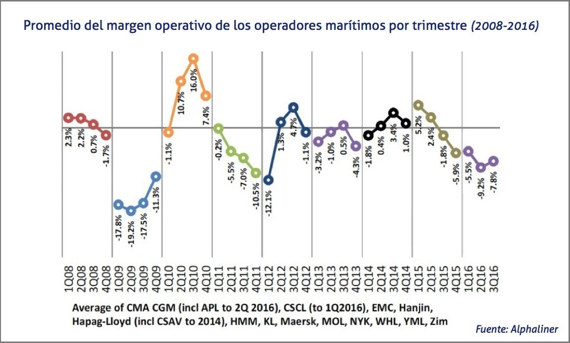 El margen operativo de los principales operadores marítimos de contenedores refleja un resultado negativo medio del -7,8% en el tercer trimestre de 2016, un periodo que supone el quinto trimestre de registros negativos según cifras de Alphaliner.