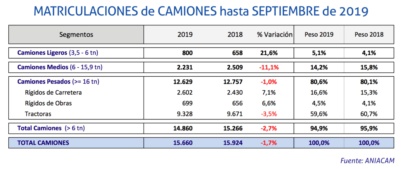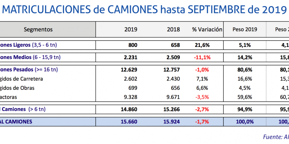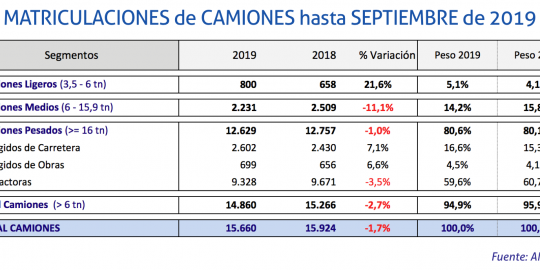 En este sentido, las tractoras siguen perdiendo pie, mientras que las caídas en los camiones ligeros, que entre enero y agosto de 2019 presentan un potente crecimiento, se han trasladado ahora a camiones medios.