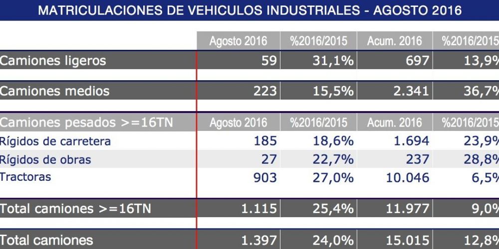 El mercado de vehículos industriales en agosto de 2016 ha aumentado un 24% en comparación con el octavo mes de 2015. En total, se han matriculado en 1.397 vehículos, lo que supone 270 unidades más que en agosto del ejercicio anterior, según los datos de Aniacam.