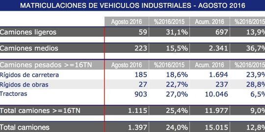 Por su parte, los medios han crecido un 15,5%, con 223 unidades, 30 más que en agosto de 2015. En este caso, Iveco, con un 54,26% de cuota, sigue dominando las matriculaciones.