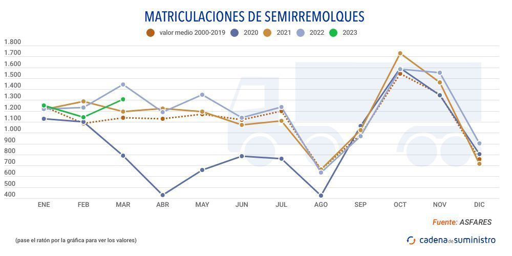 Según los datos de Asfares, la asociación que agrupa a los fabricantes españoles de remolques, semirremolques, cisternas y todo tipo de carrocerías como lonas, basculantes, furgones, frigoríficos y contenedores, además de los fabricantes de equipos y componentes para estos vehículos, durante el pasado mes de marzo se han matriculado un total de 1.306 semirremolques, un 9,37% por debajo de las 1.441 unidades registradas durante el tercer mes de 2022.