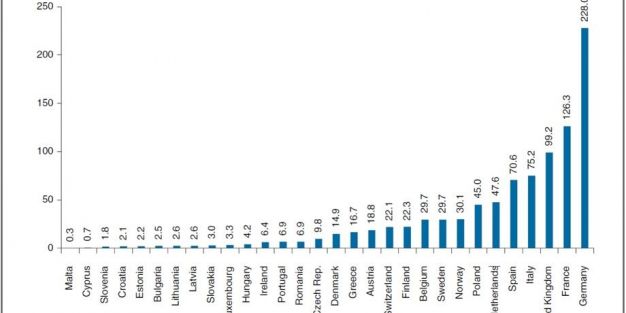 A pesar de que España se sitúe en el quinto lugar, con una cifra de negocio de 70.600 millones de euros, está lejos del volumen alcanzado por Alemania, el primer país por volumen de negocio, con 228.000 millones de euros. En segundo lugar se sitúa Francia, con 126.300 millones, seguido por Reino Unido, con 99.200 millones y por Italia, con 75.200 millones.