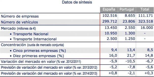Según el estudio, el mercado ibérico de transporte de mercancías por carretera registró en 2012 una caída del 6,7%, situándose en 16.000 millones de euros. La facturación en España fue de 13.450 millones de euros, cifra que supone el 84% del total, mientras que el mercado portugués se cifró en 2.550 millones.