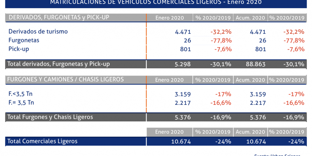 En el primes mes de 2020, el mercado español de vehículos comerciales ha mantenido la misma tónica que en 2019, con una clara tendencia a la baja. Así, se han entregado un total de 10.674 vehículos comerciales, lo que supone un 24% menos que en el mismo periodo del año anterior, según los datos de Aniacam.