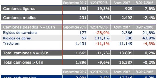El acumulado hasta septiembre de 2017 refleja un ligero repunte del 0,2% en las unidades matriculadas con respecto al mismo periodo del ejercicio anterior, con un total de 17.316 vehículos industriales.