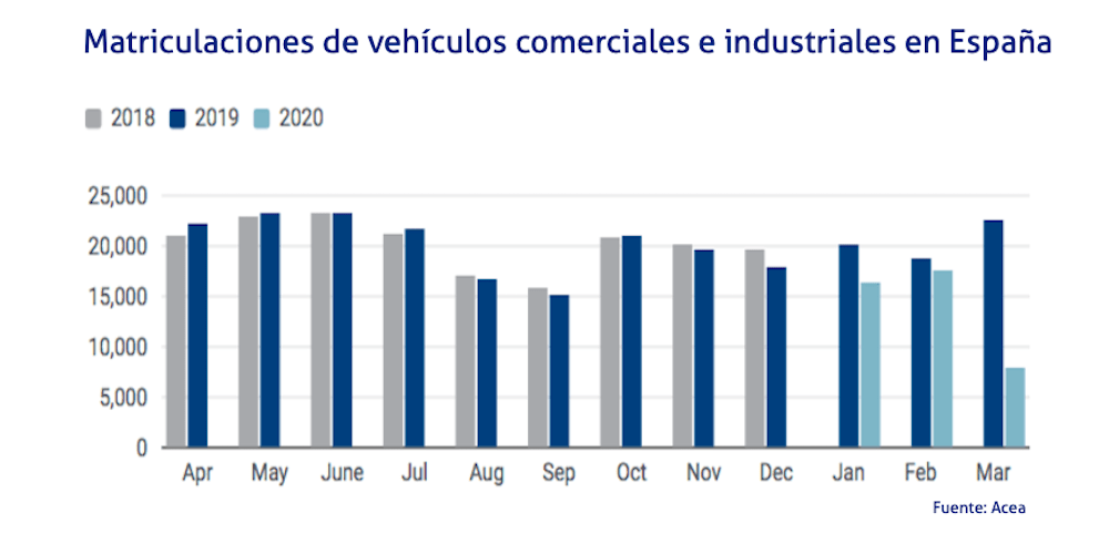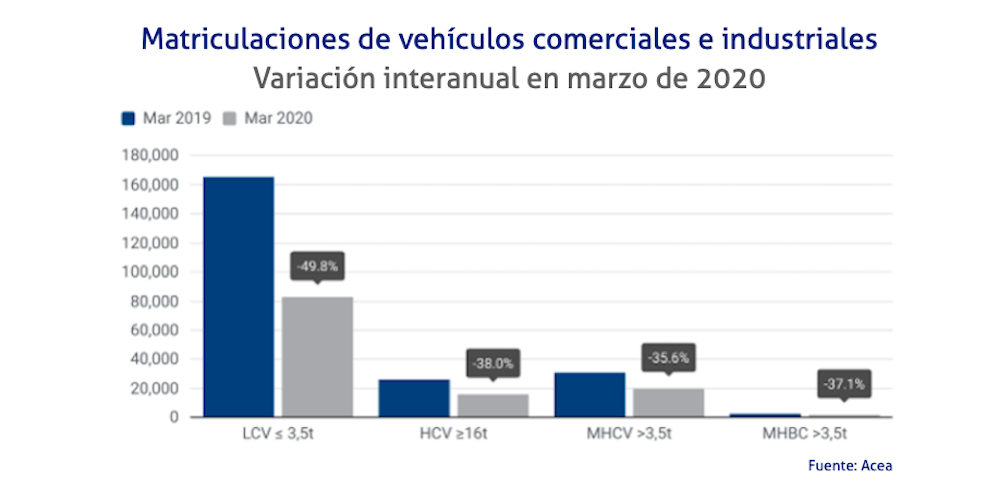 Las matriculaciones de vehículos comerciales e industriales en la Unión Europea han caído un 47,3% en marzo de 2020, según los datos de la Asociación Europea de Fabricantes de Automóviles, Acea. Este fuerte retroceso se debe a las medidas para la prevención del Covid-19, que han llevado al cierre de los concesionarios.