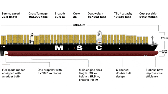 Construido en los astilleros coreanos de Daewoo Shipbuilding & Marine Engineering, el buque más eficiente del mundo, al poder cargar hasta 19.224 TEUs y reducir un 35% en las emisiones de CO2, fue bautizado el pasado 8 de enero de este 2015, destronando los 19.100 TEUs del CSCL Globe.