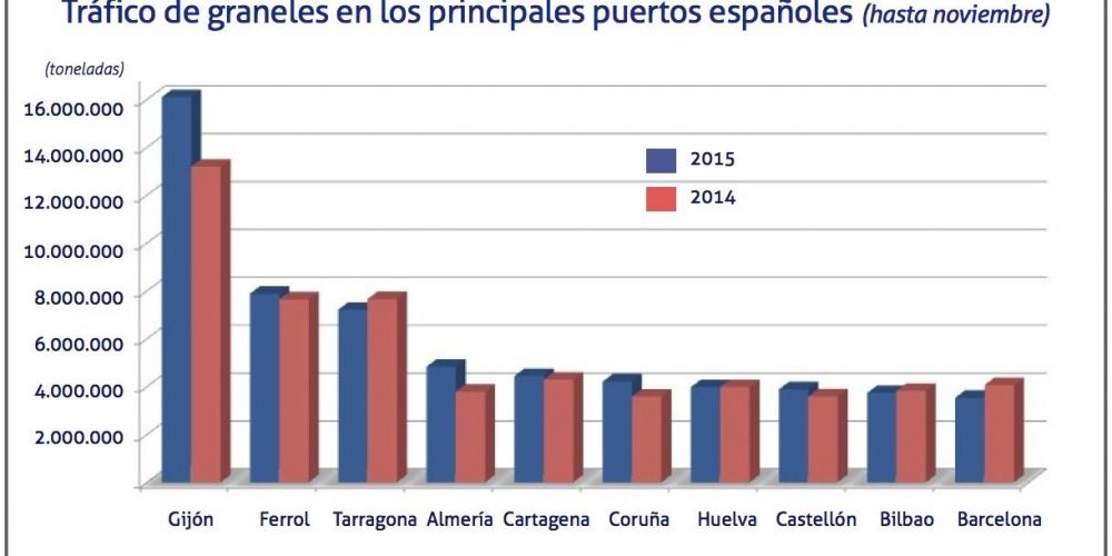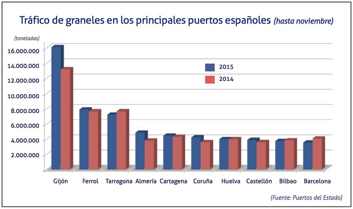 Según los datos de Puertos del Estado, en el período interanual hasta octubre de 2015, el puerto de Gijón, con un total de 16.094.568 toneladas de graneles sólidos, el primer puerto español en este tipo de tráficos, con un 22% más que hace un año. le siguen a mucha distancia, Ferrol y Tarragona en el entorno de los siete millones de toneladas.