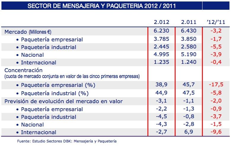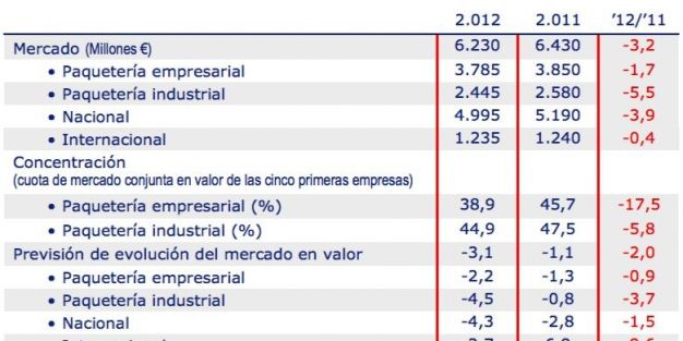 La cuota de mercado conjunta de las cinco primeras empresas de paquetería empresarial se situó en el 39% en 2012, mientras que las diez primeras reunieron el 63%. En el segmento de paquetería industrial estas participaciones se situaron en el 45% y en el 65%, respectivamente.