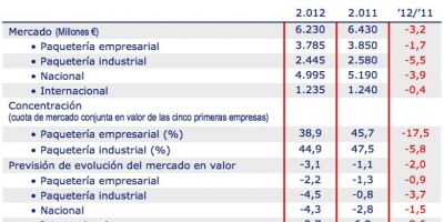 Por segmentos, la consultora indica que la paquetería empresarial muestra una evolución de sus ventas “algo” menos desfavorables que las del conjunto del mercado. Así, registra un decrecimiento del 2,2% en 2012, hasta 3.785 millones de euros. El valor del mercado de la paquetería industrial, por su parte, disminuyó un 4,5%, situándose en 2.445 millones de euros.