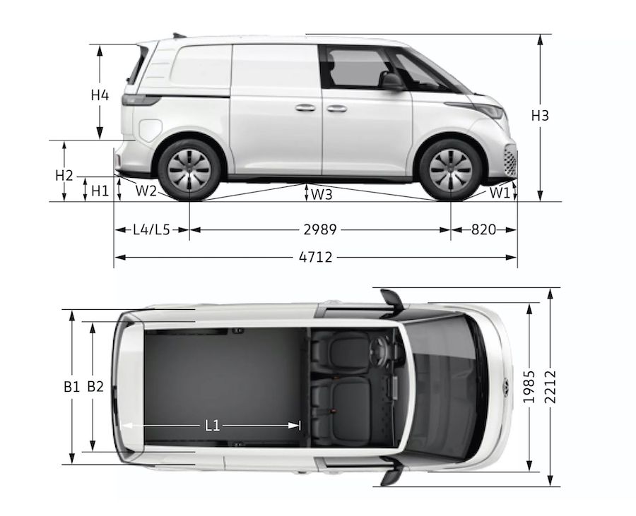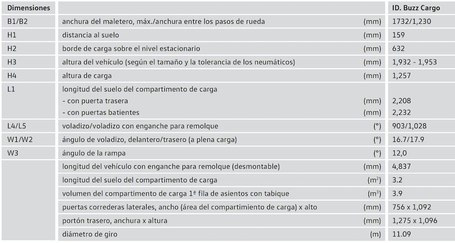 El modelo tiene una capacidad de 3.900 litros y ofrece espacio para transportar dos palets, un volumen de carga de hasta 3,9 m³ y una carga útil de 650 kg. El ID. Buzz Cargo está equipado con un portón trasero de amplia apertura y una puerta corrediza en el lado del acompañante, pero también se puede montar una puerta corrediza adicional en el lado del conductor y puertas traseras de dos hojas.