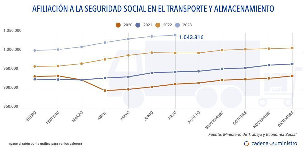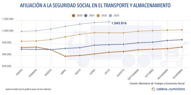 El volumen de afiliados a la Seguridad Social en el segmento de transporte y almacenamiento sigue al alza y consolida esta tendencia durante los siete primeros meses de 2023, con luna trayectoria paralela a la seguida en el tramo que fue de enero a julio de 2022.