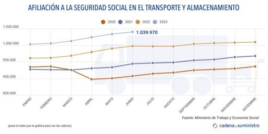 Así pues, en el mes de junio se han registrado un total de 829.174 afiliados en el régimen general del transporte y almacenamiento, lo que implica un ascenso de un 0,69% con respecto a mayo, con 5.670 personas afiliadas más a este régimen en el sector, según datos oficiales.