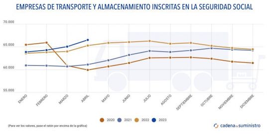 Durante el pasado mes de abril ha vuelto a incrementarse el número de empresas de transporte y almacenamiento inscritas en la Seguridad Social y mantiene la tendencia al alza que lleva en los cuatro primeros meses de 2023.