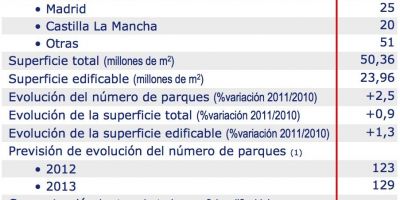 De esta forma, para el cierre de 2013 el número total de parques operativos en España podría situarse en 129, dotados con más de 58 millones de m² de superficie total y alrededor de 28,5 millones de m² de superficie edificable.