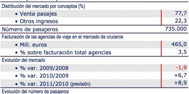 La cifra de negocio de las agencias de viaje por venta de cruceros se situó en 465 millones de euros en 2010, un 7% más que en 2009. Esta cifra supone el 3,5% de la facturación total de este tipo de operadores, participación que ha aumentado en los últimos años.