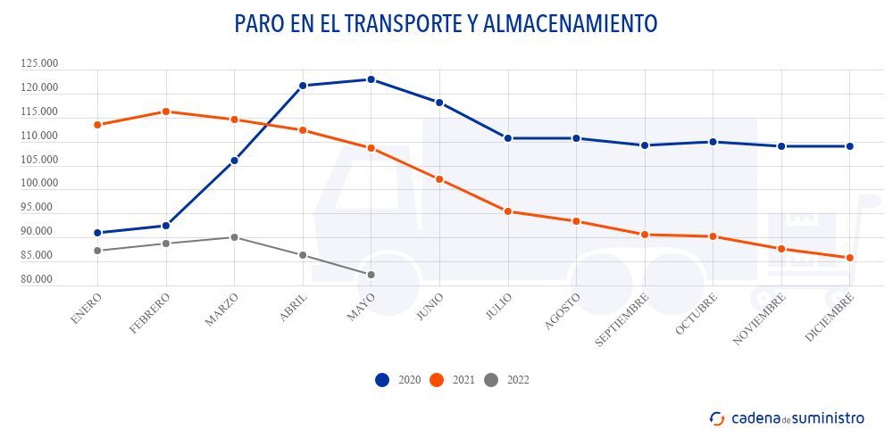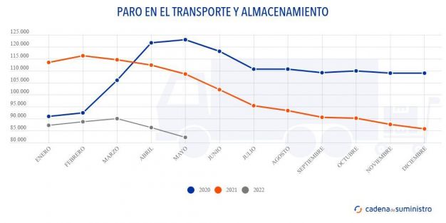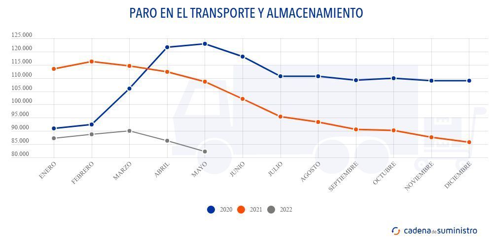 El sector español de transporte y almacenamiento contaba durante el quinto mes de 2022 con 82.286 parados, un 24,27% menos que en el quinto mes de 2021, así como un 4,72% menos que en abril de este mismo año.