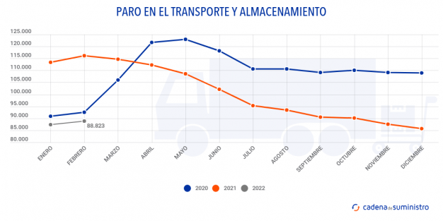 Los datos de paro en el sector logístico y de transporte se han incrementado en cómputo mensual en los dos primeros meses de 2022 con incrementos, pero el registor de desempleo en este segmento de actividad está por debajo de los registros del primer bimestre de 2019, cuando aún no había irrumpido la pandemia.