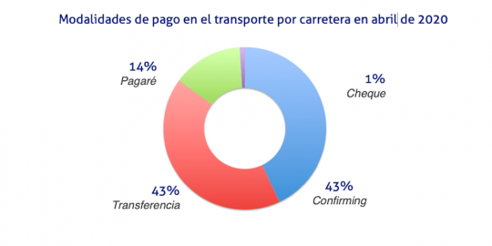 Los resultados del cuarto mes del ejercicio apuntan a que los medios de pago preferidos por los clientes de los transportistas son el confirming, con un 43%, seguido por la transferencia, con otro 43%, el pagaré, con un 14%, y el cheque, con menos de un 1%.