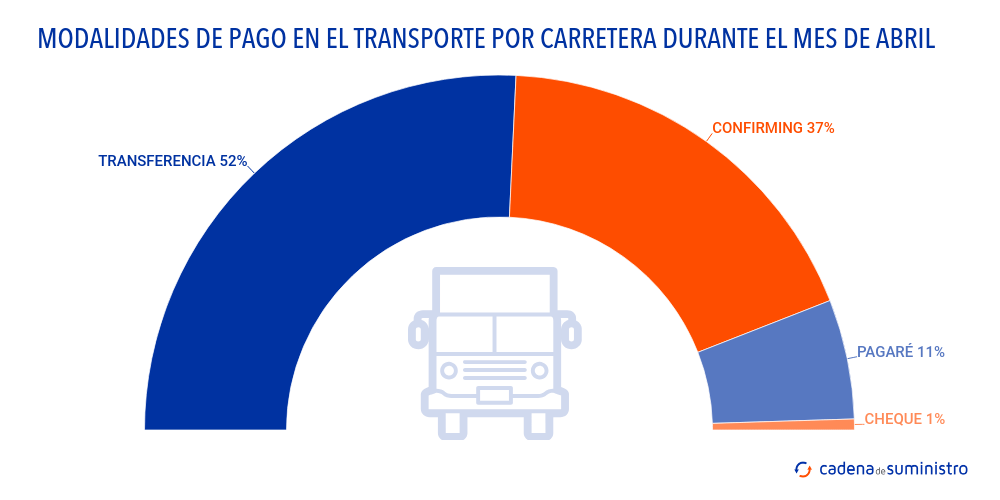 Los resultados del octavo mes de 2021 apuntan a que los medios de pago preferidos por los clientes de los transportistas son la transferencia, con un 52%, seguido por el confirming, con otro 37%, el pagaré, con un 11%, y el cheque, con menos de un 1%.