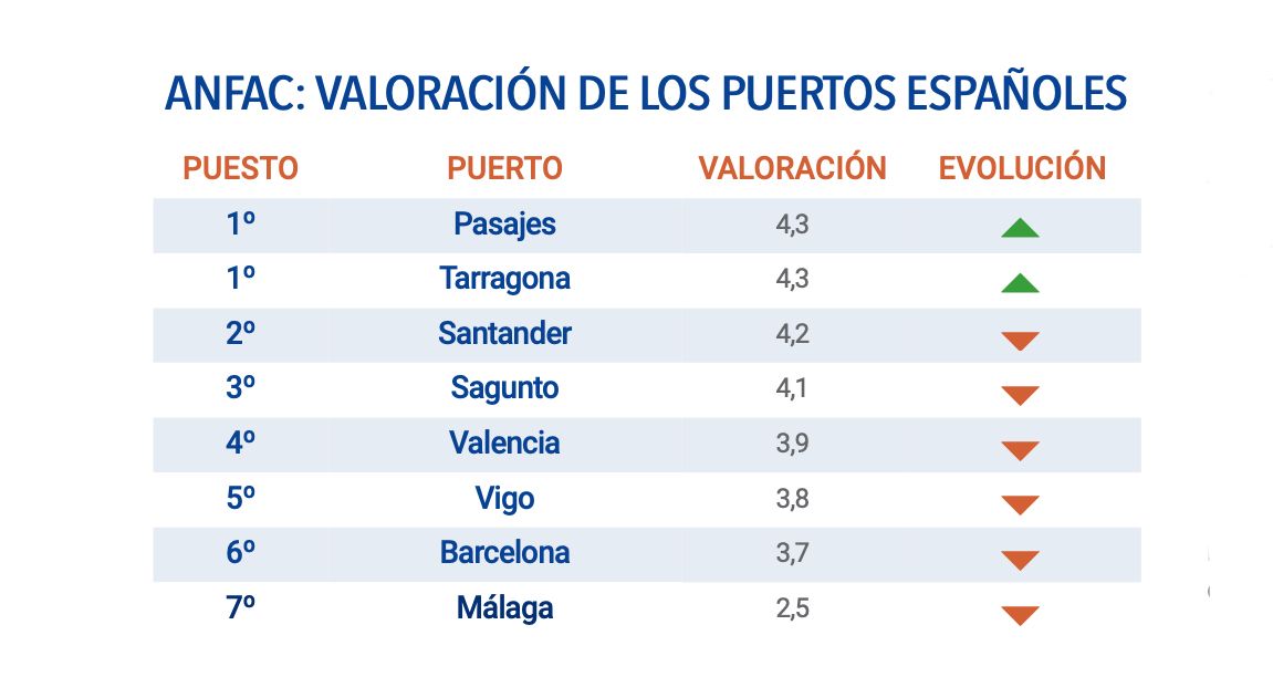 Según Anfac, Pasajes y Tarragona son los puertos mejor valorados para el tráfico de vehículos, con un 4,3 sobre 5. Santander, que el año anterior encabezaba la clasificación, ha descendido hasta el segundo puesto, con un 4,2, mientras que Sagunto, con un 4,1, ocupa el tercer lugar.