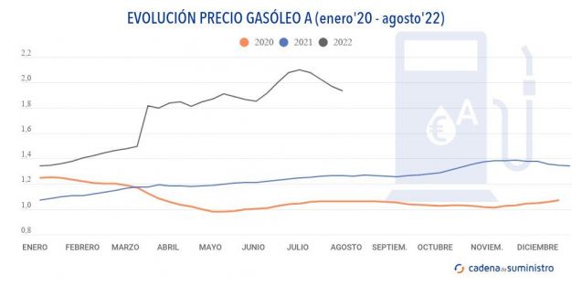 El precio del gasóleo comenzaba 2022 en los 1,347 euros por litro, y la gasolina en los 1,476. En la segunda semana de junio, el primero había alcanzado ya los 2,003 euros, y la segunda los 2,117, lo que supone incrementos del 48,70% y del 43,42% respectivamente.