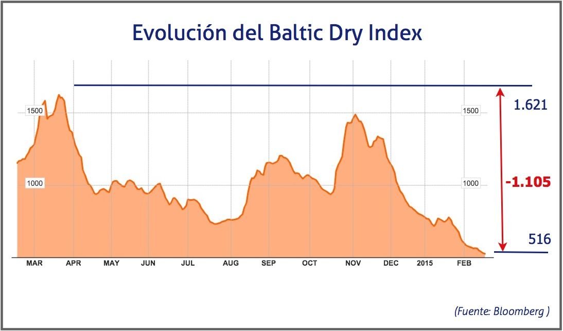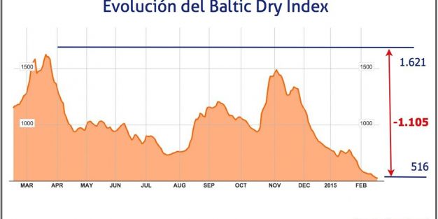El Baltic Dry Index cae de nuevo, después de que el 17 de febrero terminara en 516 puntos. Esto supone que en lo que va de año ha caído un 33,0%, y representa una caída superior al 55% con respecto al nivel de febrero del 2014.