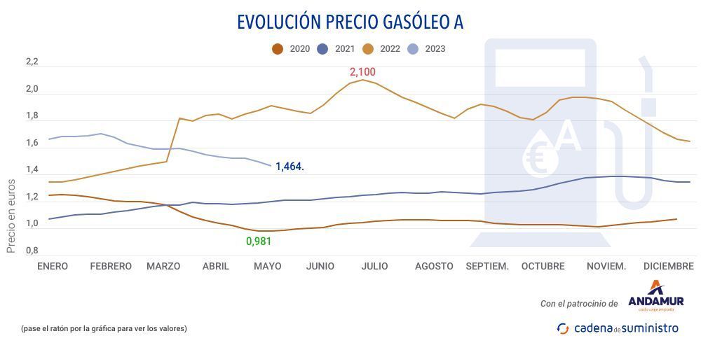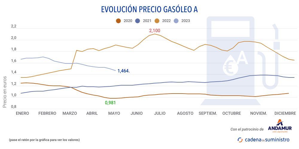 Ambos combustibles siguen una semana más por debajo del importe que marcaban antes de la entrada en vigor de la ayuda de 20 céntimos por litro que aprobó el Gobierno a finales de marzo de 2022, y que fue prorrogada hasta el 30 de junio de 2023 para el transporte profesional por carretera.