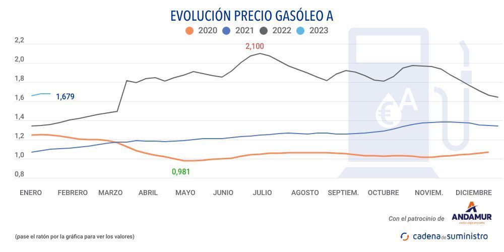 El precio del gasóleo se ha reducido en un 0,11% en España entre la semana del 10 al 16 de enero de 2023, pasando de los 1,681 a los 1,679 euros actuales, según recoge el último Boletín Petrolero de la Unión Europea.