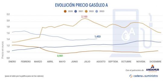 Ambos combustibles siguen una semana más por debajo del importe que marcaban antes de la entrada en vigor de la ayuda que aprobó el Gobierno a finales de marzo de 2022, y que fue prorrogada por el Gobierno hasta finales de 2023 para el transporte profesional por carretera. No obstante, el descuento será de 10 céntimos por litro hasta el 30 de septiembre y de cinco céntimos hasta final de año.