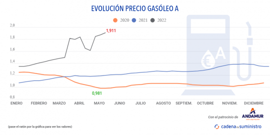 La cantidad alcanzada supone una semana más un récord para este combustible, que continúa por encima del precio de la gasolina en el país. Esta se encuentra actualmente en 1,878 euros, tras incrementarse un 2,23% respecto a los 1,837 euros del registro anterior.