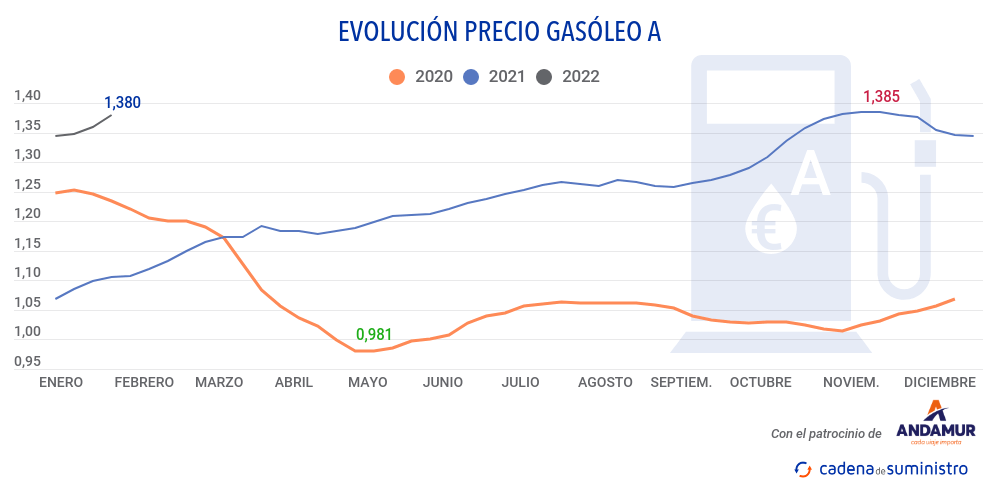 El precio del gasóleo se ha situado en los 1,380 euros entre el 11 y el 17 de enero, según los datos proporcionados por el Boletín Petrolero de la Unión Europea. Esto supone un incremento del 1,54% respecto a la semana anterior, cuando se encontraba en los 1,359, y su nivel más alto desde la penúltima semana de noviembre.