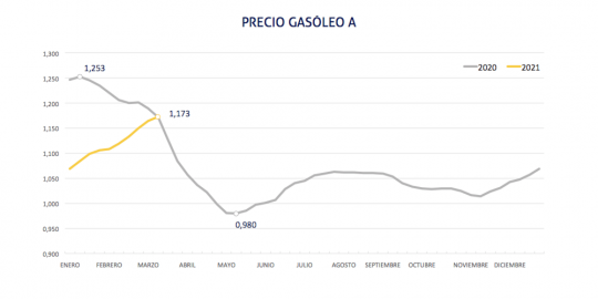 El gasóleo, que se encuentra en su nivel más elevado desde el 9 de marzo de 2020, acumula ya una subida de en torno al 15,68% desde la segunda semana de noviembre, cuando inició esta carrera al alza.