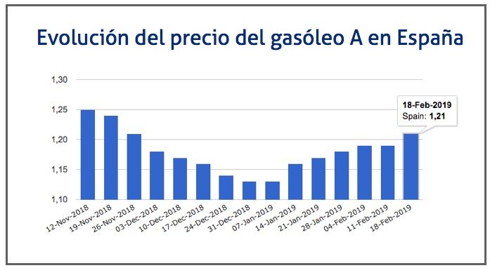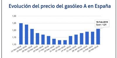 El precio del gasóleo se ha situado entre los días 12 y 18 de febrero de 2019 en los 1,200 euros, lo que implica un aumento del 0,84% respecto a los 1,190 que marcaba la semana anterior, y del 6% respecto al registrado al inicio de 2019.